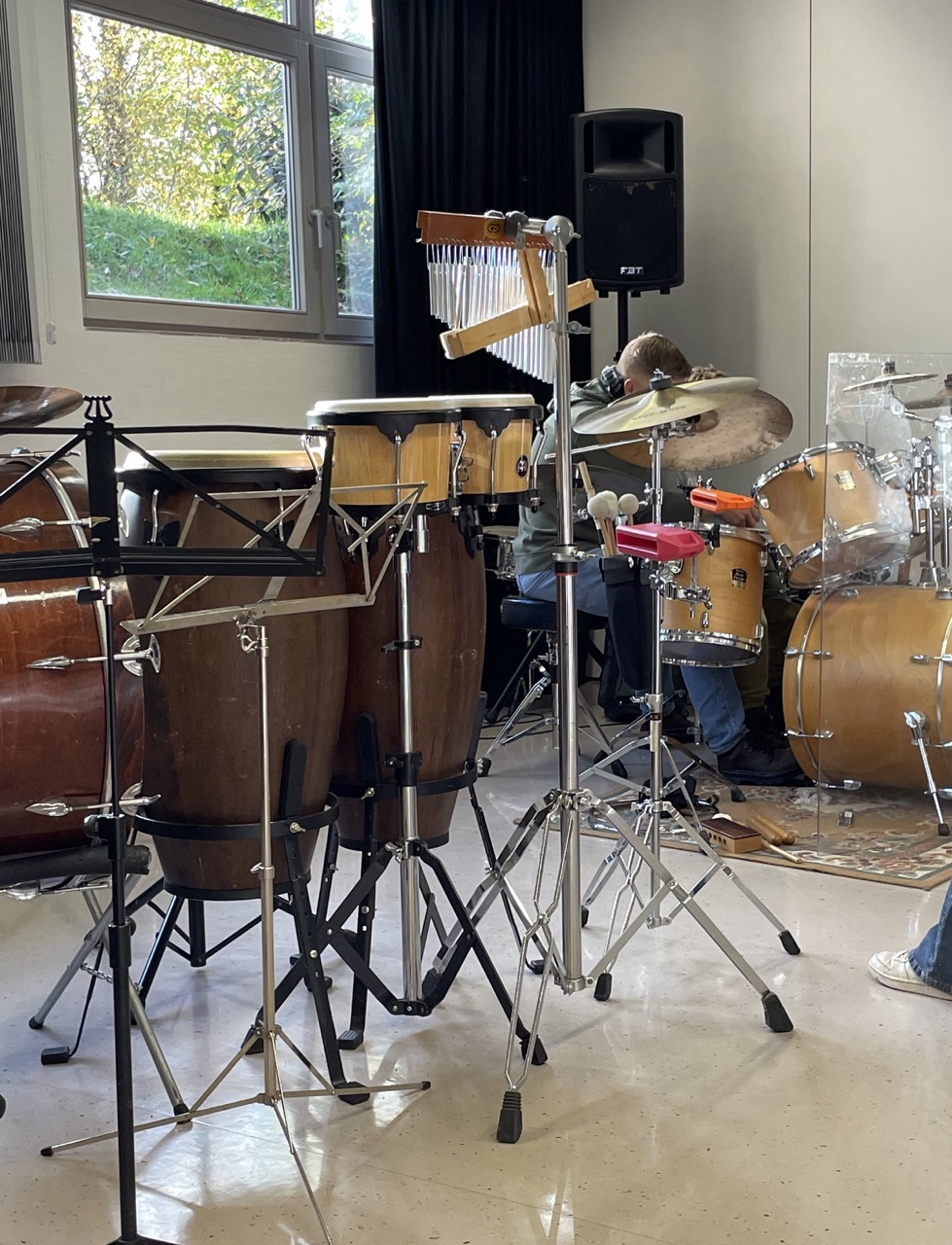 Da wurde gebrummt, gepfiffen, gequietscht und gehaucht …- und zwischendrin hörte man die schmissigen Rhythmen des Schlagzeuglehrers, der den Kindern ab und an gekonnt die Hand führte.