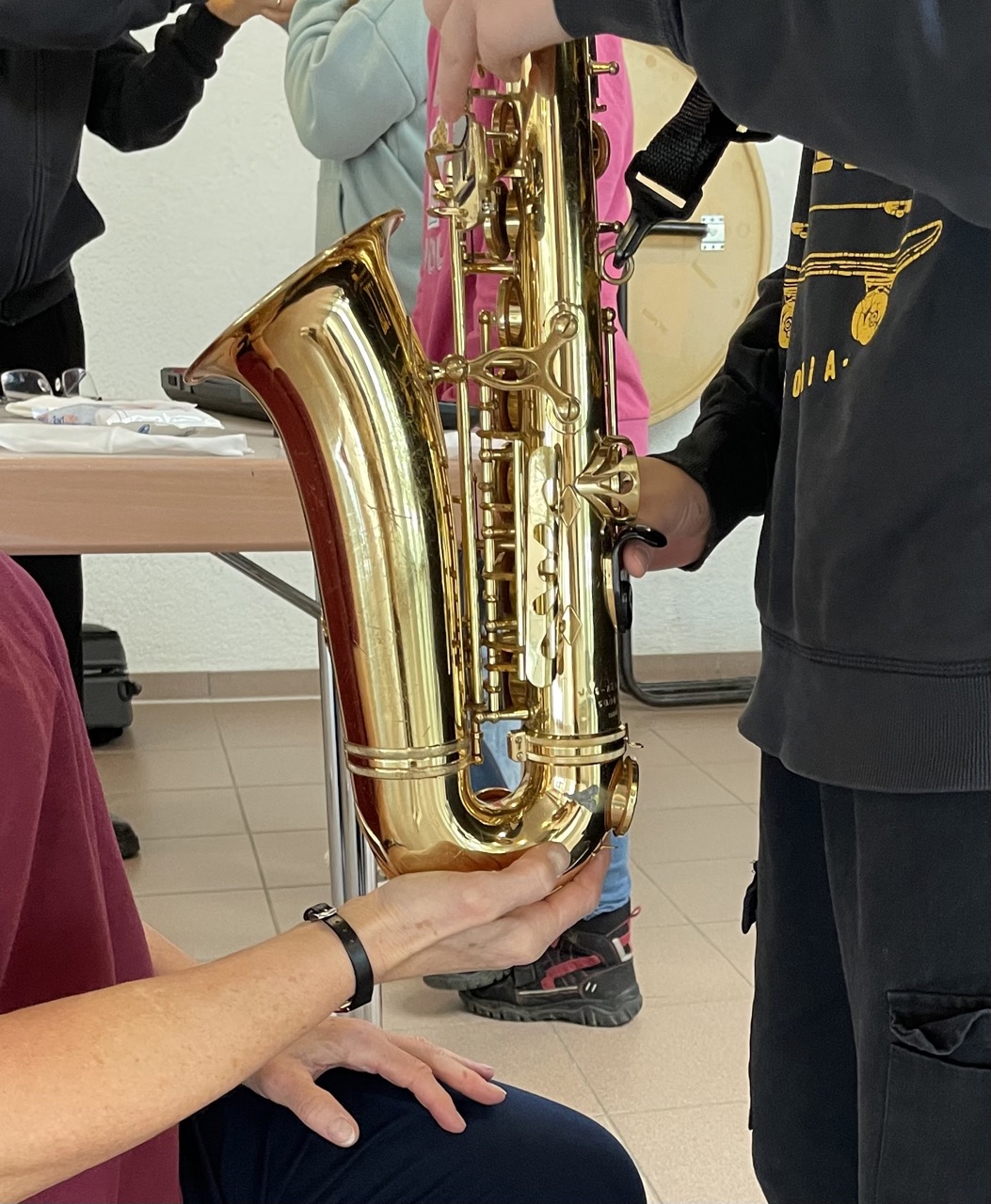 Nach einer allgemeinen Einführung durften die Kinder in drei Kleingruppen alle Instrumente ausprobieren und dabei ihre persönlichen Favoriten entdecken. Es gab eine Schlagzeuggruppe, eine Gruppe mit Blechblas- und eine weitere Gruppe mit Holzblasinstrumenten. Nach 20 min wurden die Gruppen gewechselt, so dass jedes Kind mindestens einmal mit jedem Instrument in Berührung kam.